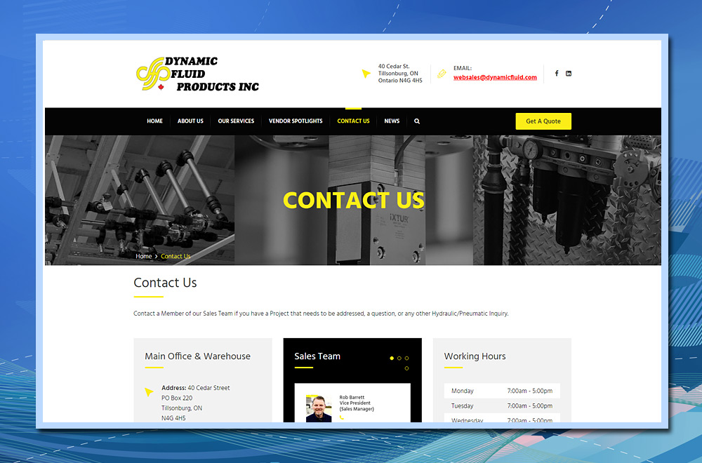 17 Designs launched this WordPress website for Southwestern Ontario’s Premier Industrial Supplier of Fluid Power Products: www.dynamicfluid.com. The site features a Slider Revolution banner with hydraulic video, the various Industries served, an expanding chart of the rapid growth and history of the business, the Services offered, a Quote Inquiry form, a Google Map, recent News and nine Vendor Spotlight pages.